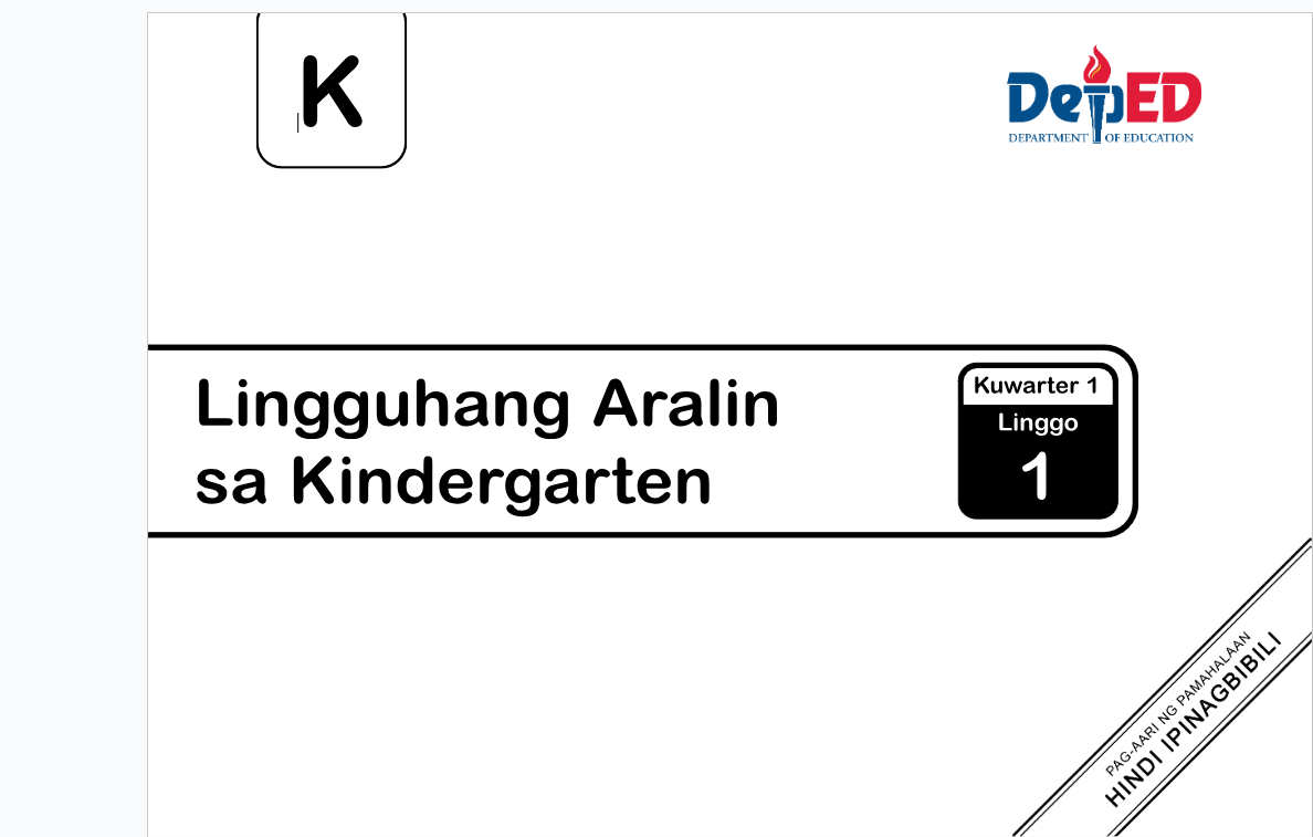 The SDO Olongapo City Kindergarten Teachers Guide is a 36 week instructional resource package aligned to the content and pedagogy of the MATATAG Kindergarten Curriculum. Its added feature is the incorporation of the ALPABASA READING PROGRAM in Circle Time 1. ALPABASA utilizes action songs, movement-based activities, and games to help every child become a READER by playing with language and enhancing their reading skills while appreciating Filipino language and culture.